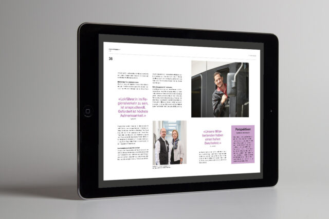 Für die Geschäftsberichte 2022 und 2023 holt Thurbo Stier und Bergen an Bord. In enger Zusammenarbeit mit dem Kommunikationsteam entstehen ausgewählte Beiträge. Allen Texten gehen Interviews voraus, unter anderen mit der Geschäftsleitung, dem VR-Präsidenten sowie mit Thurbo Mitarbeitenden aus unterschiedlichen Abteilungen. (Bild: © Foto Thurbo)